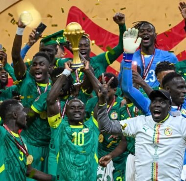 CAF President Patrice Motsepe celebrates Veron Mosengo-Omba